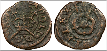 AE Farthing 14mm. 0.70g. Crown before crossed sceptres. CAROLV; -D;G -M [A: BRI] Crowned rose. [FRA: ET HI: REX (star) S. 3206 Fine. Some roughness.