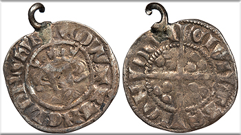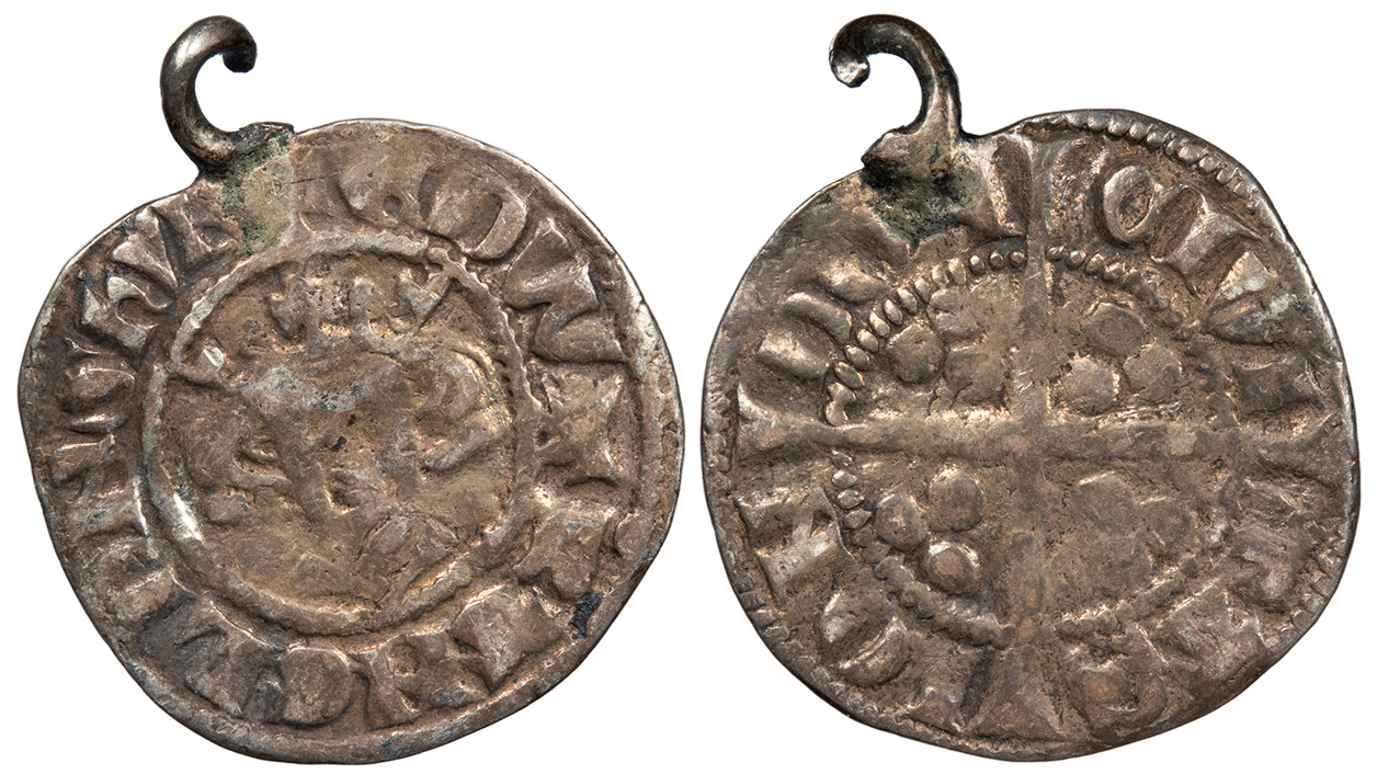 AR Penny 18mm. 1.37g. London Mint. Crowned bust facing. + EDWAR ANGL DNS hyB Long cross quartered with pellet trefoils. CIVI -TAS -LON -DON VF. Toned. Partial loop attached.