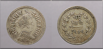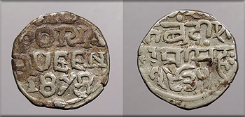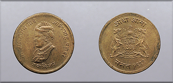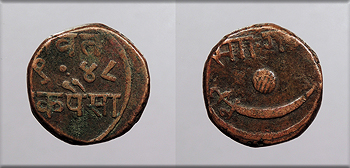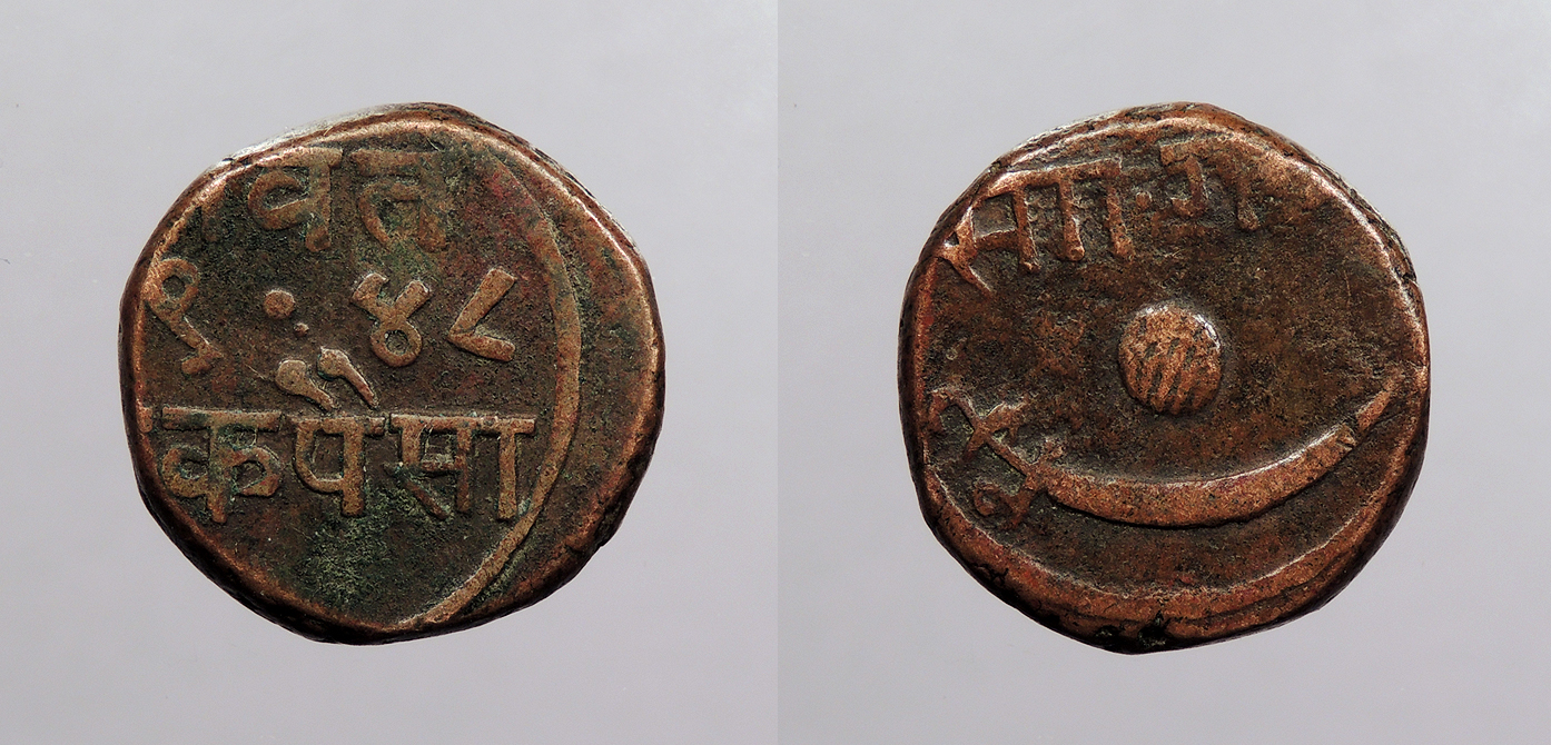 Bow and arrow pointing downward, Nagari 'ja' (initial letter of Jayaji) to r., frozen date (RY23) to l. (off flan).