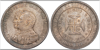 AR 1000 Reis 33mm. 25.01g. 400th Anv. Discovery of India Conjoined busts left.