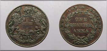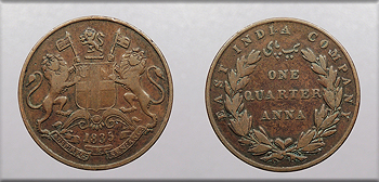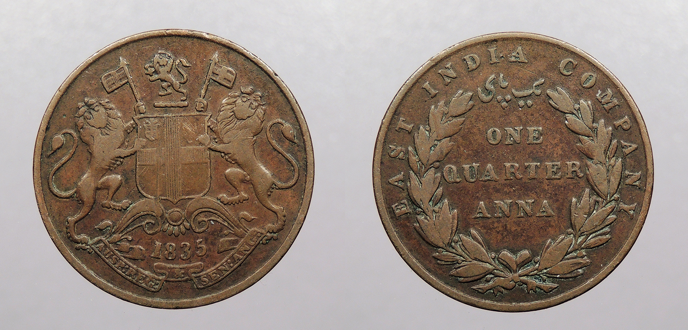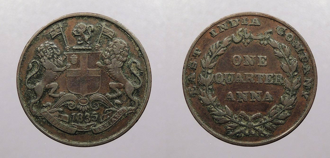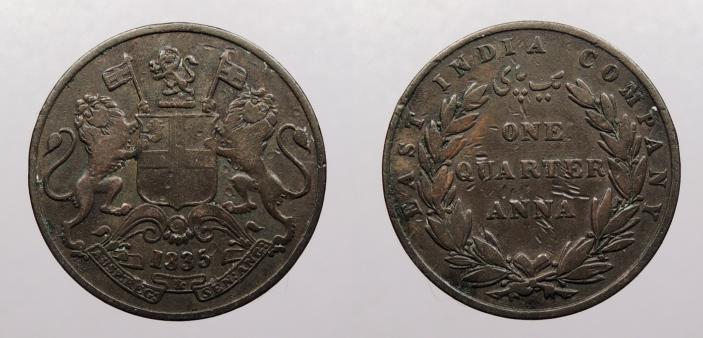 INDIA East India Co. British 1835 (b) 25.2 mm 1/4 Anna -- #:WC108245
