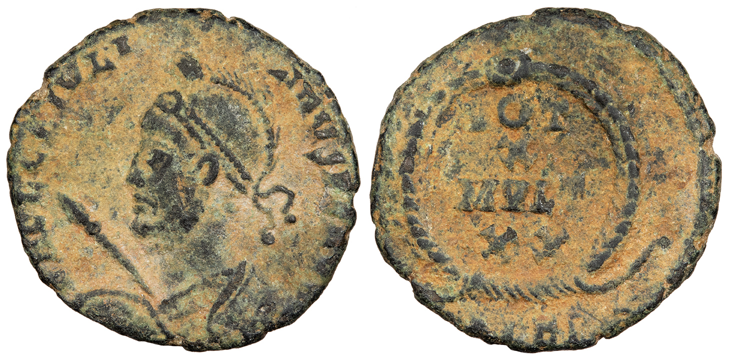 AE3 18mm. 3.26g. Alexandria Mint 361-363 A.D. Pearl-diademed, helmeted and cuirassed bust l., holding spear and shield. D N FL CL IVLIANVS P F AVG Legend in four lines within wreath; In ex.: ALE(gamma) VOT / X / MVLT / X X RIC VIII 91 Near VF. Dark green patina with desert fill. Some trace roughness.