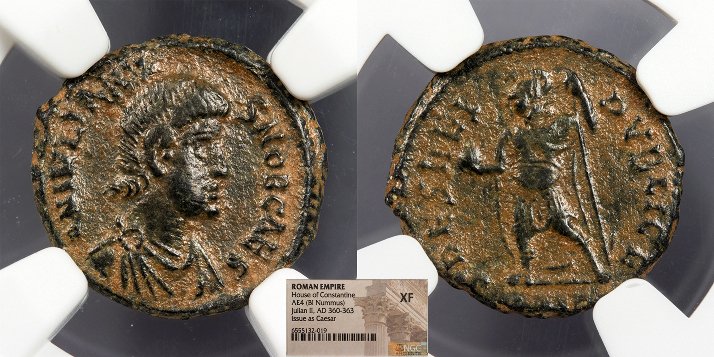 AE4 13mm. Heraclea mint (?) 355-361 A.D. Bare-headed, draped bust r. D N IVLIANV-S NOB CAES Emperor, helmeted and in military dress, standing l., holding globe and spear; In ex.: [SMHA] SPES REI-PVBLICE cf. RIC VIII 99 EF. NGC Scarce. Dark patina with some nice 'desert' fill. Very slight roughness. Mintmark off flan. NGC certified 'XF.'