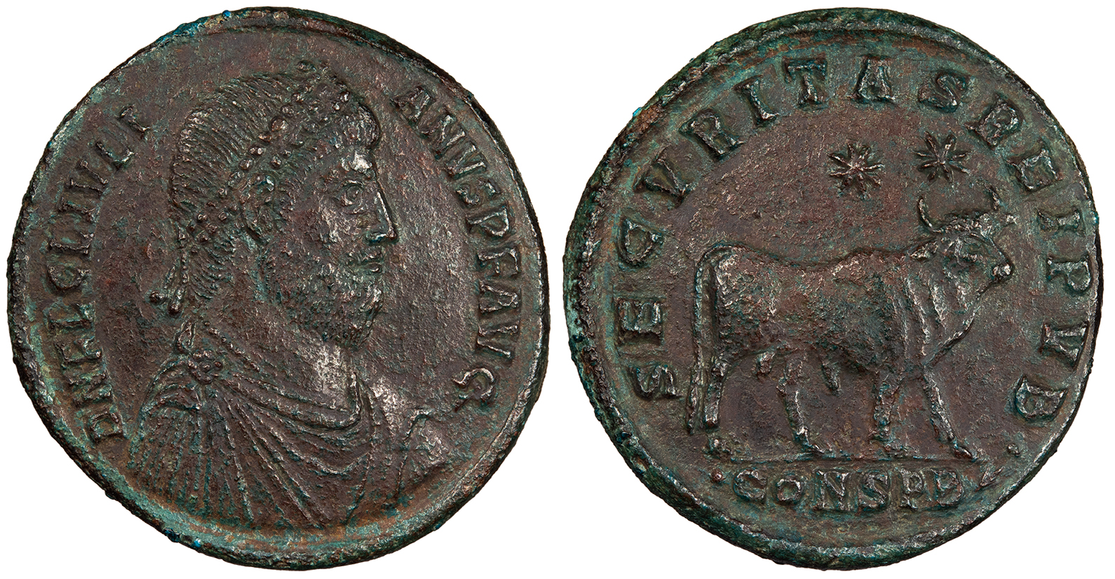 AE Double Maiorina 29mm. 8.08g. Constantinople Mint 361-363 A.D. Pearl-diademed, draped and cuirassed bust, r. D N FL CL IVLI-ANVS P F AVG Bull standing r., two stars above; In ex.: .CONSPB(palm). SECVRITA REIPVB RIC VIII 162 Good VF. Brown and green patina. Nice detail. Some cleaning and tool marks, primarily in fields. Some light roughness and adhesions, mostly on edge.