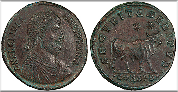 AE Double maiorina 28mm. 7.59g. Arles Mint 360-363 A.D. Pearl-diademed, draped and cuirassed bust, r. D N FL CL IVLIA-NVS P F AVG Bull standing r., two stars above, eagle with wreath in beak before; In ex.: TCONST. SECVRITAS REI PVB RIC VIII 322 Fine. Dark brown patina. High points cleaned and coppery. Some light marks and roughness. Listed as 'R' in RIC.