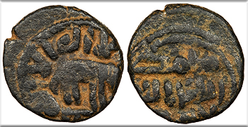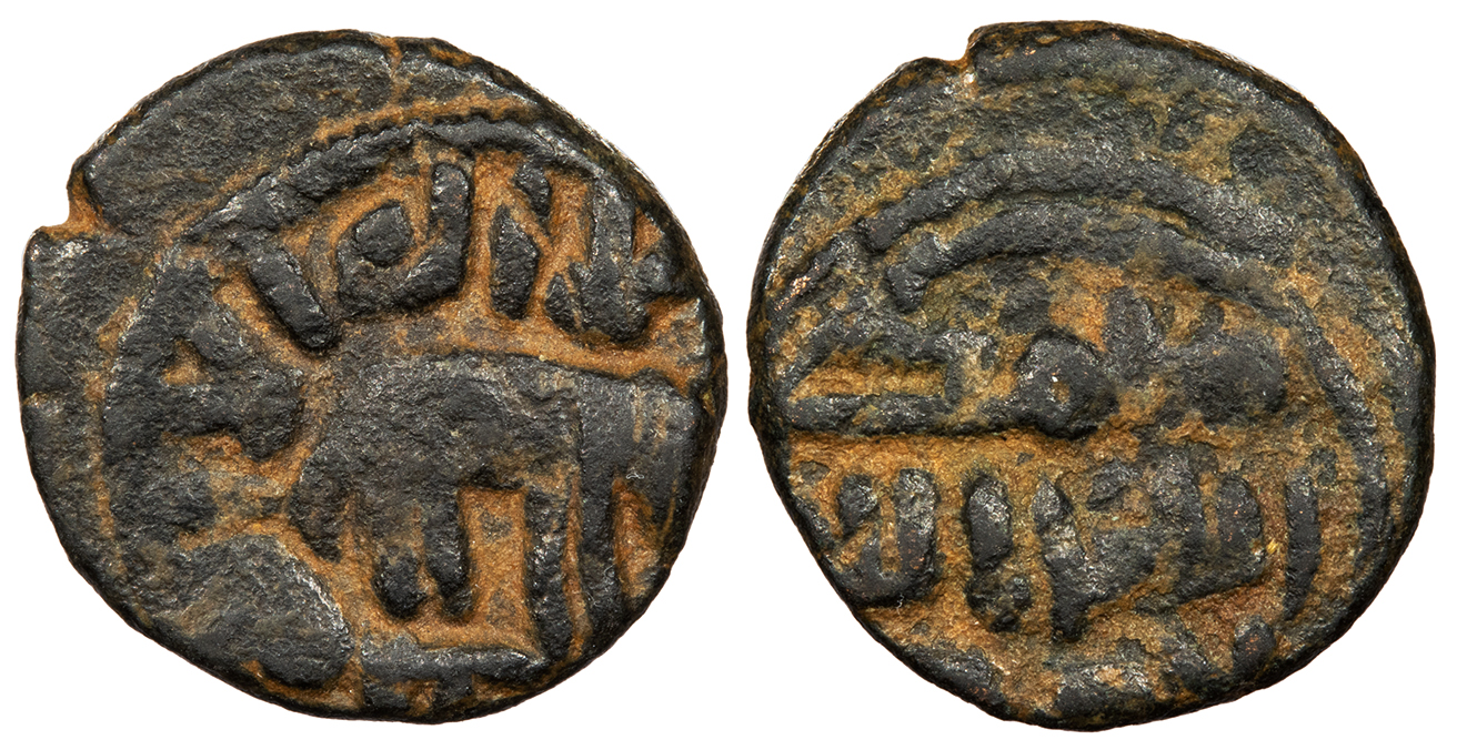 AE Fals 16mm. 2.91g. Hims (Homs) mint Elephant r.; 'There is no god but Allah, the One' in Arabic around.