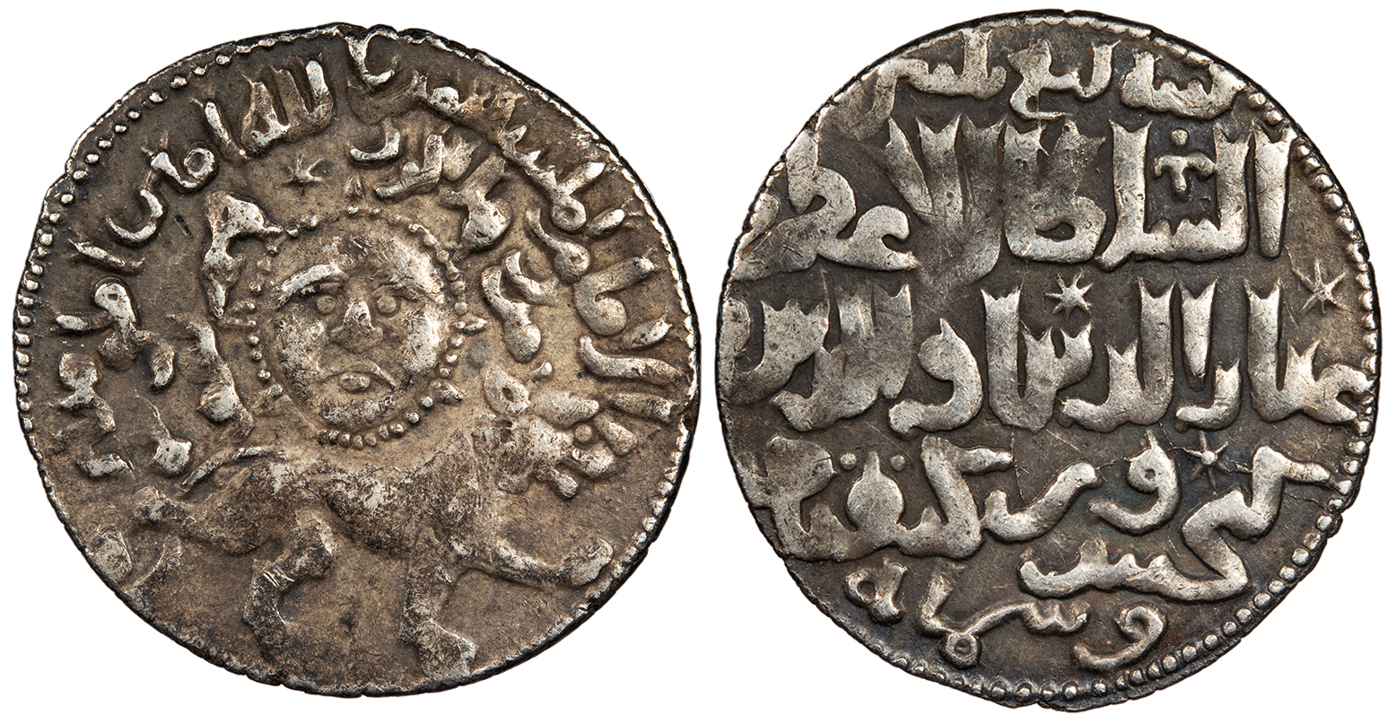 AR Dirham 22mm. 2.91g. Konya mint AH639 (1241 A.D.) Central sun face, outer legend citing Abbasid caliph al-Mustansir, inner legend with mint formula, lion below.