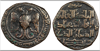 AE Dirham 29mm. 6.89g. Sinjar Mint AH584 (1188 A.D.) Double-headed eagle facing with wings displayed; [laqabs and ism of Abbasid Caliph al-Nasir on breast]; mint formula and date in outer margin.