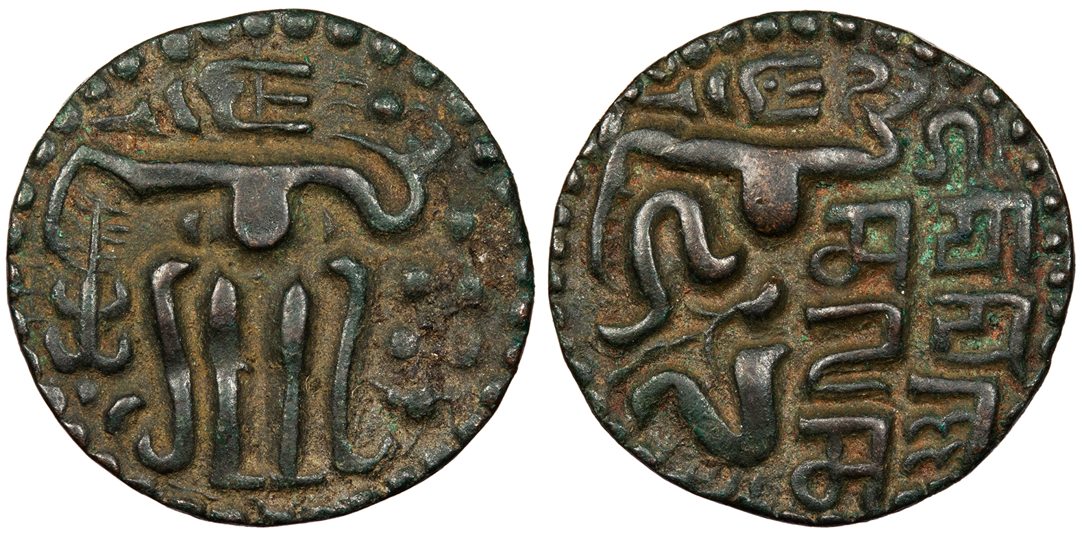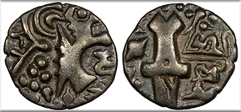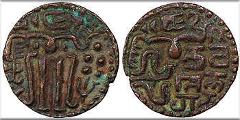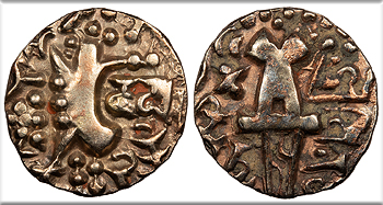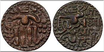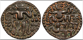 SRIMA SAHASA MALLA (in Brahmi) Sahassa Malla seated front, head r., holding uncertain object in his l. hand.