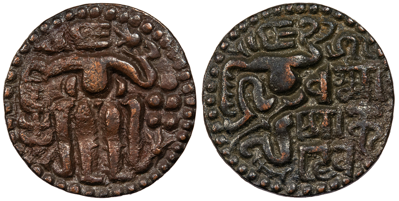 SRI DHARMASOKA DEVA (in Brahmi) King seated front, head r., holding uncertain object in his l. hand.