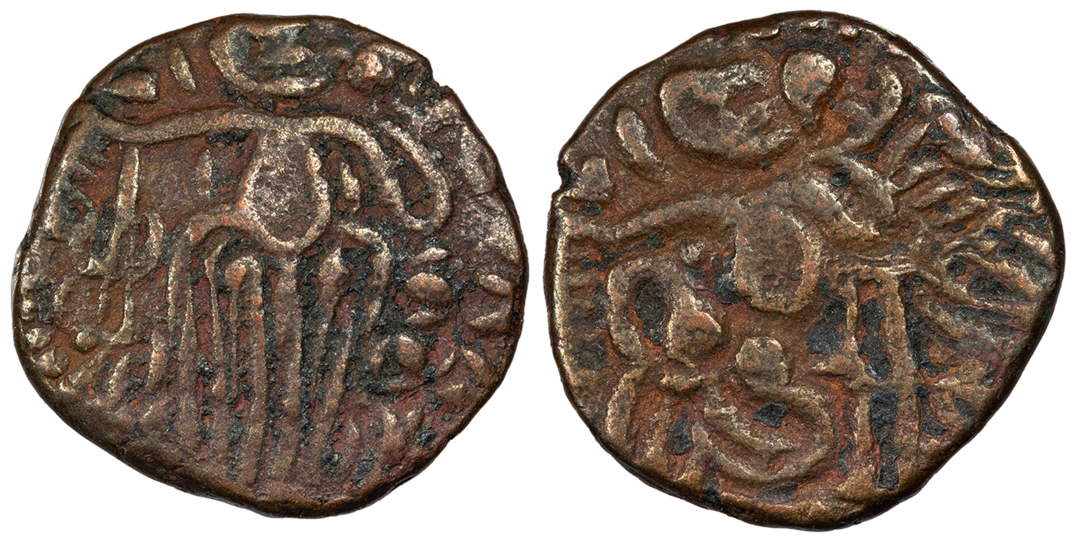 Mitch. 3656ff. VF. Brassy tan patina with good contrast. Completely debased 'Kidara' type dinar, derived from the Kushan 'standing king' types. This example is so debased that it appears to be made entirely of bronze or copper, with little to no apparent gold or silver content. The low weight could also imply a contemporary counterfeit.