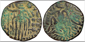 AE Massa 20mm. 4.20g. King standing front, head r., smelling lotus flower held in his l. hand; in field to r., five pellets above lotus flower; in field to l., altar.