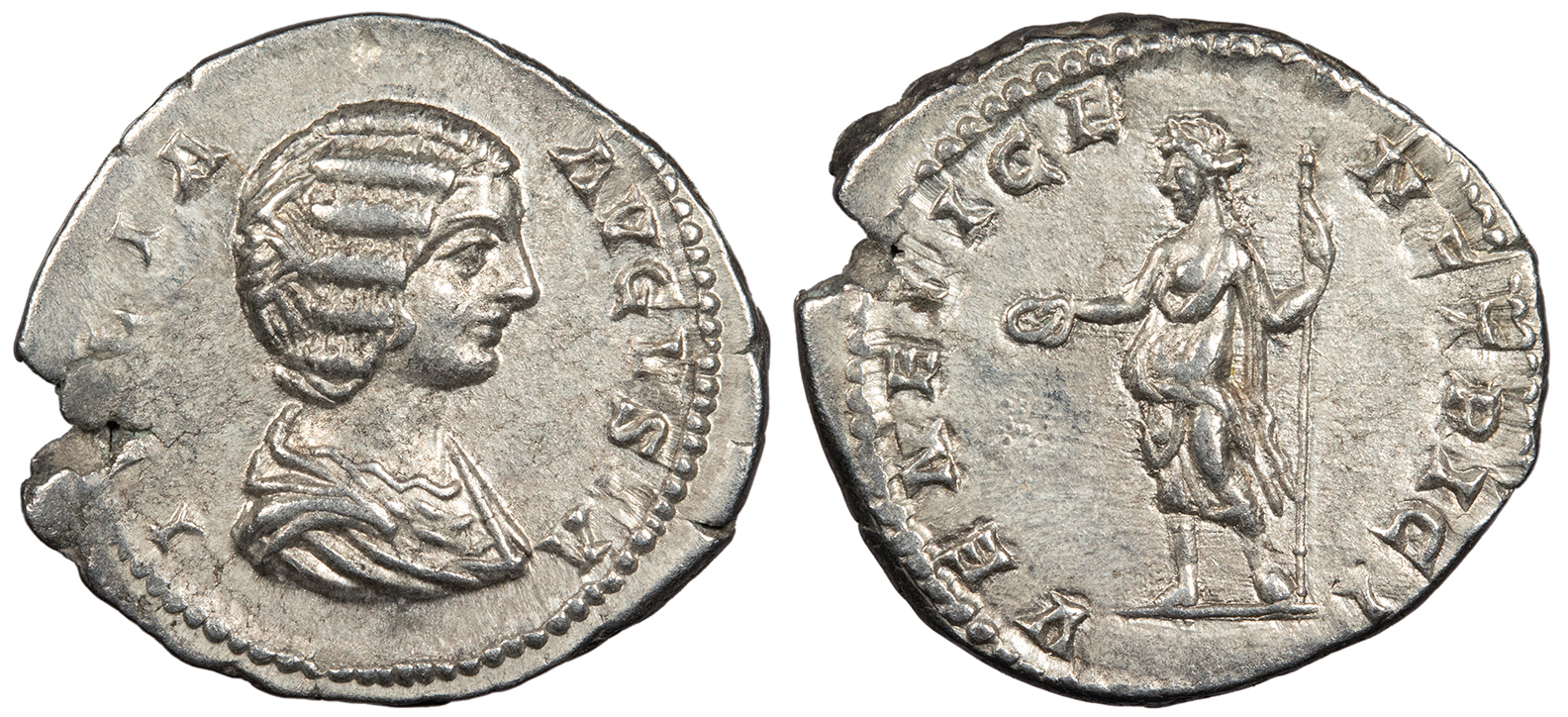 AR Denarius 20mm. 3.19g. Rome Mint 198-202 A.D. Draped bust, r. IVLIA AVGVSTA Venus Genetrix standing l., holding patera and sceptre. VENERI GENETRICI RIC IV 578; RSC 185 Good VF. Scarce. Lightly toned and brightly lustrous. Excellent detail. Small flan split. ex. Harlan J. Berk, with ticket citing ex. Philip Ashton collection (1998).
