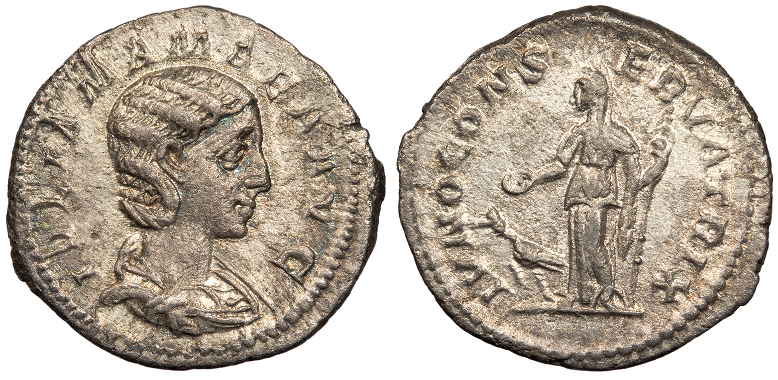 AR Denarius 20mm. 2.61g. Rome Mint 222 A.D. Draped bust, r. IVLIA MAMAEA AVG Juno Conservatrix standing l., holding patera and scepter; to l., peacock standing l. IVNO CONSERVATRIX RIC IV 343; RSC 35 Good VF. Toned and lustrous. Some faint porosity.