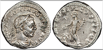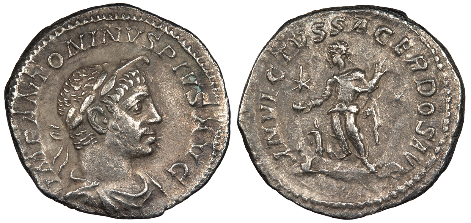 AR Denarius 20mm. 2.79g. Rome Mint 221-222 A.D. Laureate and draped bust r., wearing light beard and horn. IMP ANTONINVS PIVS AVG Emperor standing facing, head l., holding patera and club, altar with recumbent bull behind, star in l. field. INVICTVS SACERDOS AVG RIC IV 88; RSC 61 Near EF. Toned with lustrous fields. Heavily clashed reverse die.