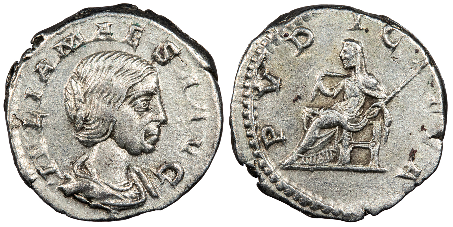 AR Denarius 19mm. 3.23g. Rome Mint 221-222 A.D. Draped bust, r. IVLIA MAESA AVG Pudicitia seated l., drawing veil and holding scepter. PVDICITIA RIC IV 268; RSC 36 Good VF. Very lightly toned. Brushed.