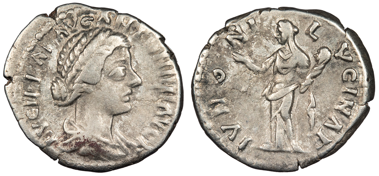 AR Denarius 19mm. 3.45g. Rome Mint 161-162 A.D. Draped bust, r. LVCILLAE AVG ANTONINI AVG F Juno, veiled and draped, standing l., raising r. hand and holding infant in l. arm. IVNONI LVCINAE RIC III 771; RSC 38 VF. Scarce. Lightly toned. Much lustre remaining. A few minor flan flaws. Reddish adhesion. ex. Roma E-Sale 107, lot 1046, with ticket. Lucina was originally a god of childbirth, but later became an epithet for Juno. Thus, expectant mothers prayed to Juno to aid in childbirth.