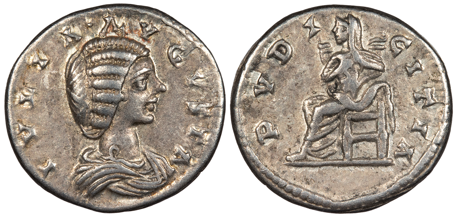 AR Denarius 18mm. 3.55g. Laodicea ad Mare Mint 196-202 A.D. Draped bust, r. IVLIA AVGVSTA Pudicitia, veiled, seated l., hand on breast. PVDICITIA RIC IV 644; RSC168a VF. Lightly toned with faint orange hues. Lustrous fields.