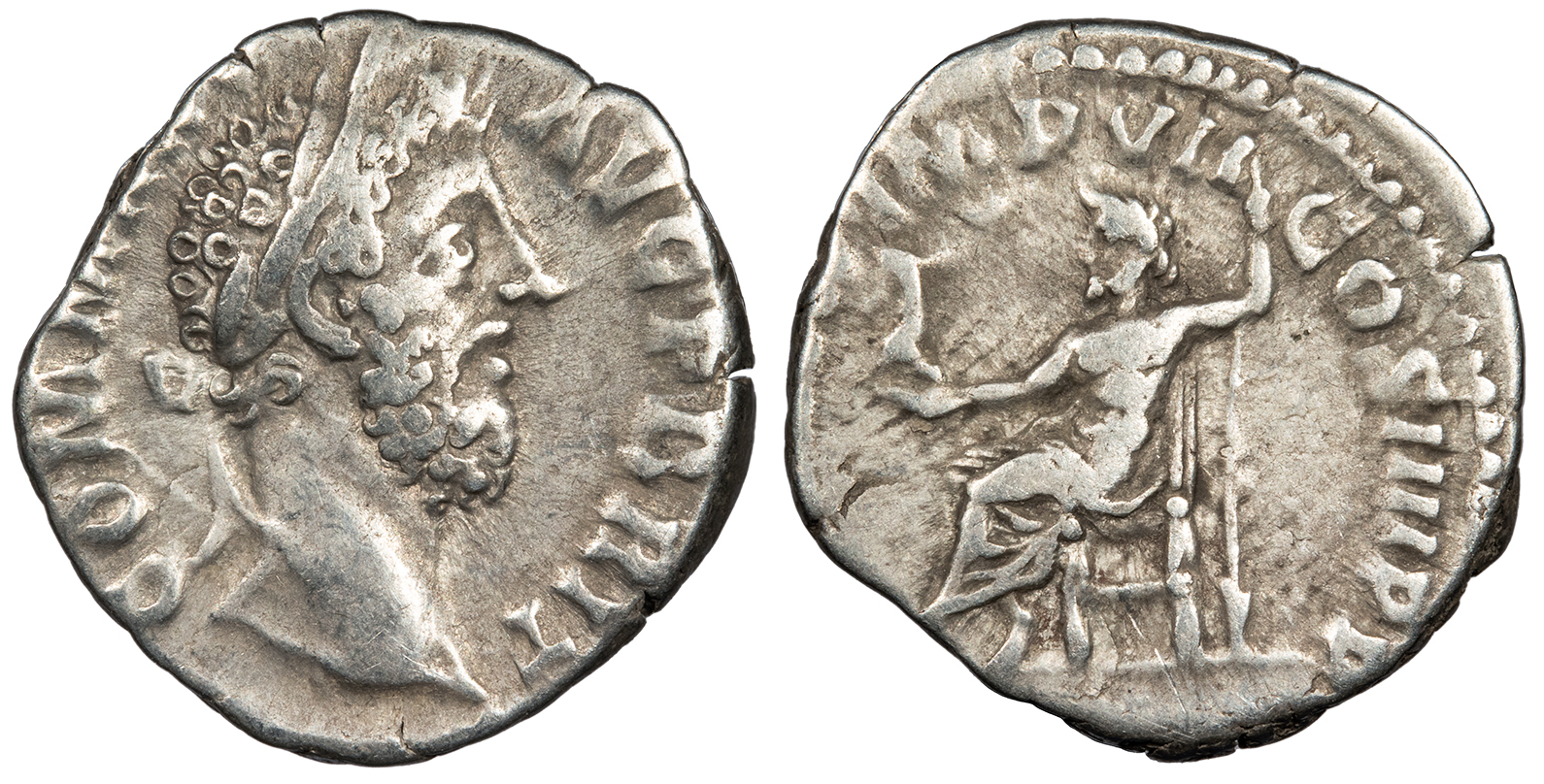 AR Denarius 17mm. 2.82g. Rome Mint 185 A.D. Laureate head, r. COMM ANT AVG P BRIT Jupiter seated l. holding Victory and spear. P M TR P X IMP VII COS IIII P P RIC III 101 var. (sceptre); RSC 472 VF. Seemingly rare. Lightly toned. Some hints of lustre in devices. Compact flan. Worn dies.