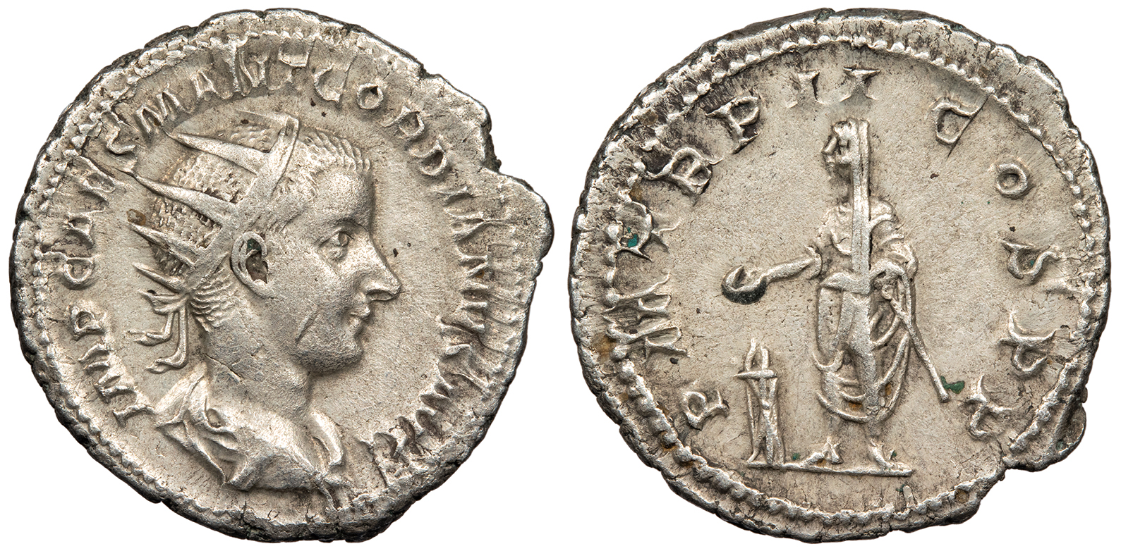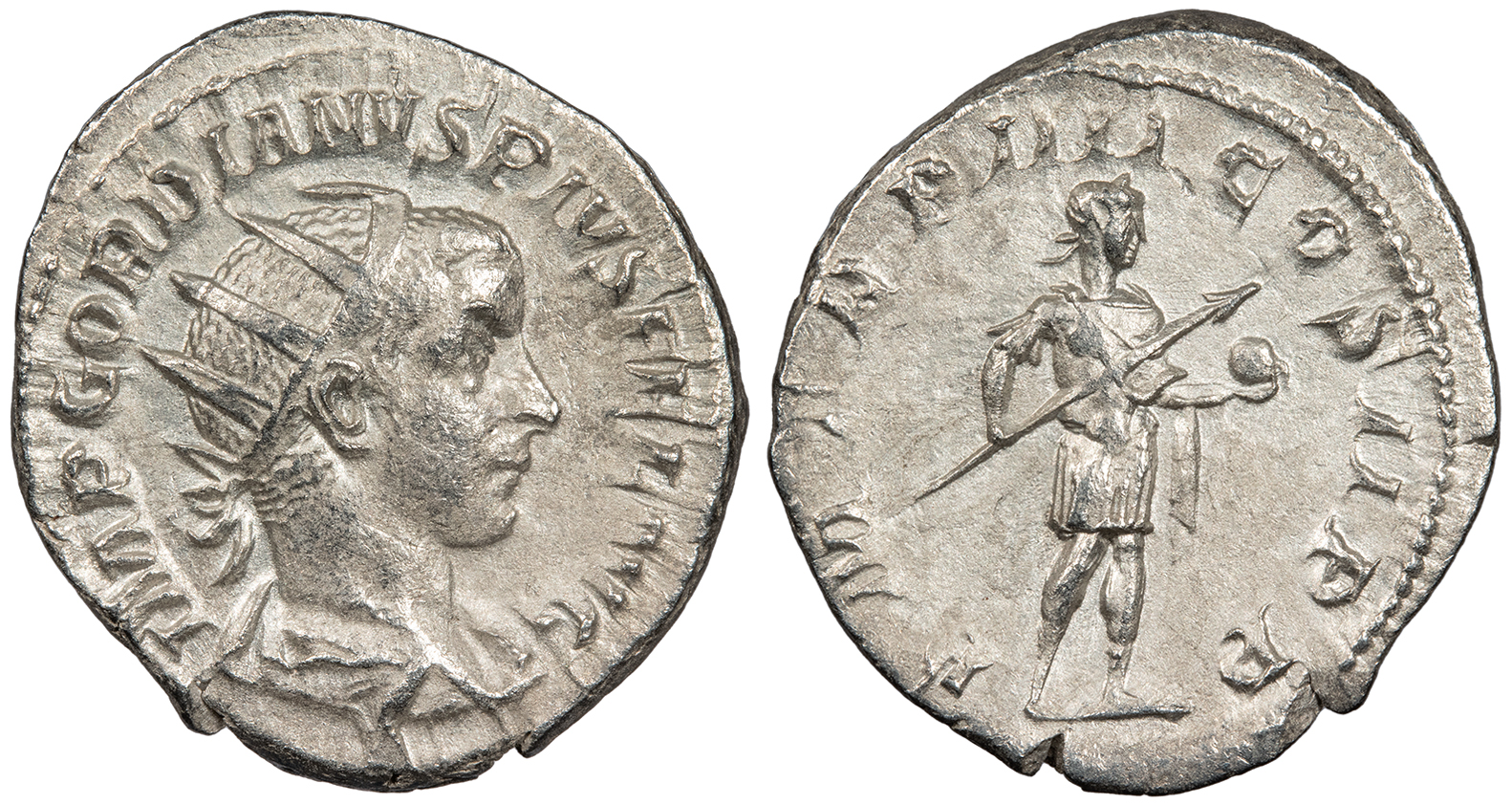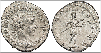 AR Antoninianus 23mm. 3.87g. Rome Mint 241-243 A.D. Radiate, draped and cuirassed bust, r. IMP GORDIANVS PIVS FEL AVG Emperor in military dress, standing r., holding transverse spear and globe. P M TR P IIII COS II P P RIC IV 92; RSC 253 Good VF. Lightly toned and lustrous.