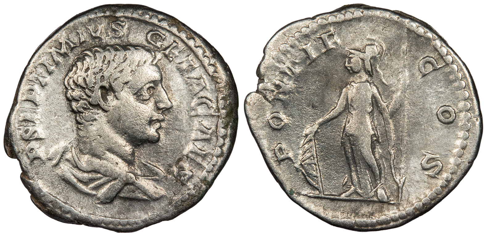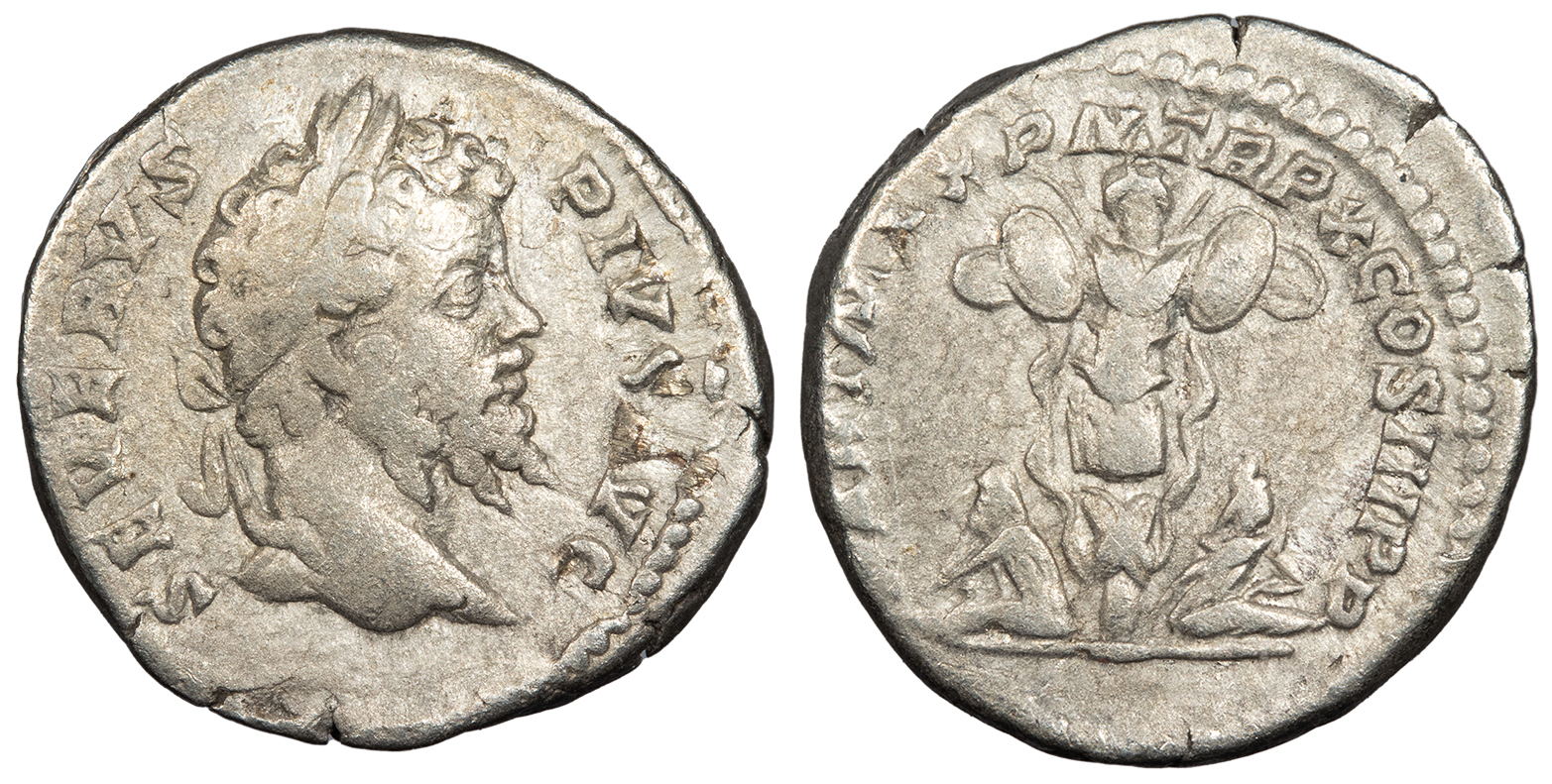 AR Denarius 19mm. 3.39g. Rome Mint 202 A.D. Laureate head, r. SEVERVS PIVS AVG Trophy, captive to either side. P M TR P X COS III P P RIC IV 185; RSC 373 Fine. Lightly toned with some lustre in fields. Faintly grainy surfaces.