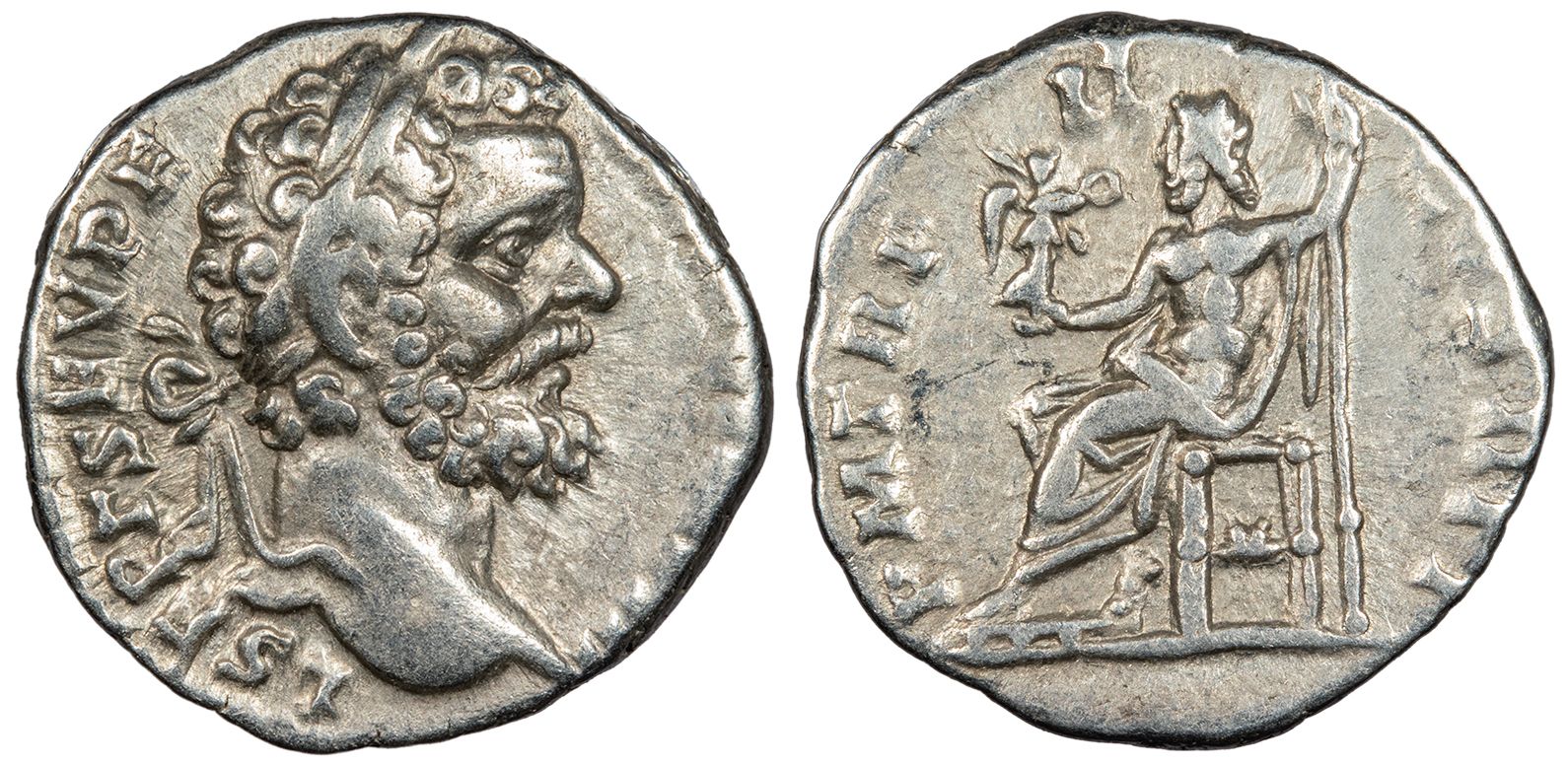 AR Denarius 17mm. 3.09g. Rome Mint 194 A.D. Laureate head, r. L SEPT SEV PERT AVG IMP III Jupiter seated l. on throne, holding sceptre and Victory. P M TR P II COS II P P RIC IV 34; RSC 380 VF. Lightly toned with lustre in devices. Some tiny faint friction marks.
