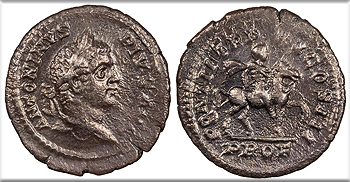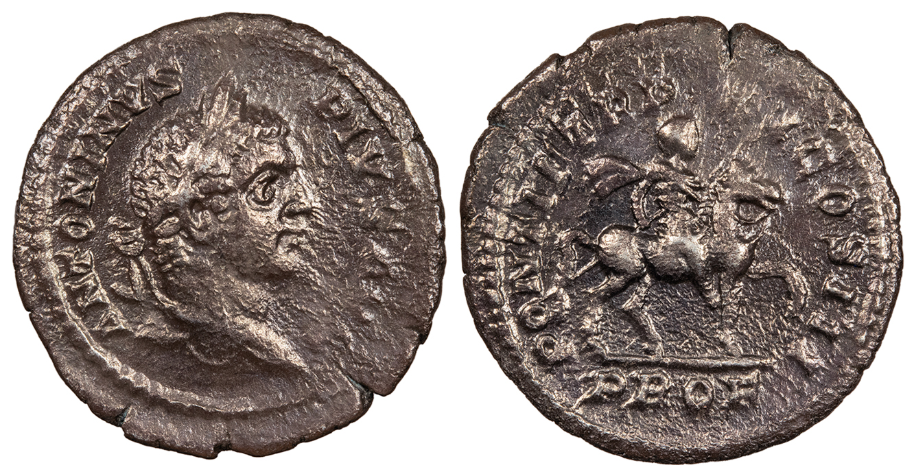 AR Denarius 20mm. 3.09g. Rome Mint 208 A.D. Laureate head, r. ANTONINVS PIVS AVG Emperor on horse r., holding spear; In ex.: PROF PONTIF TR P XI COS III RIC IV 107 VF. Glossy gray toning. Some traces of lustre in legends. Some light roughness. Possibly artificially toned.