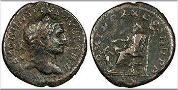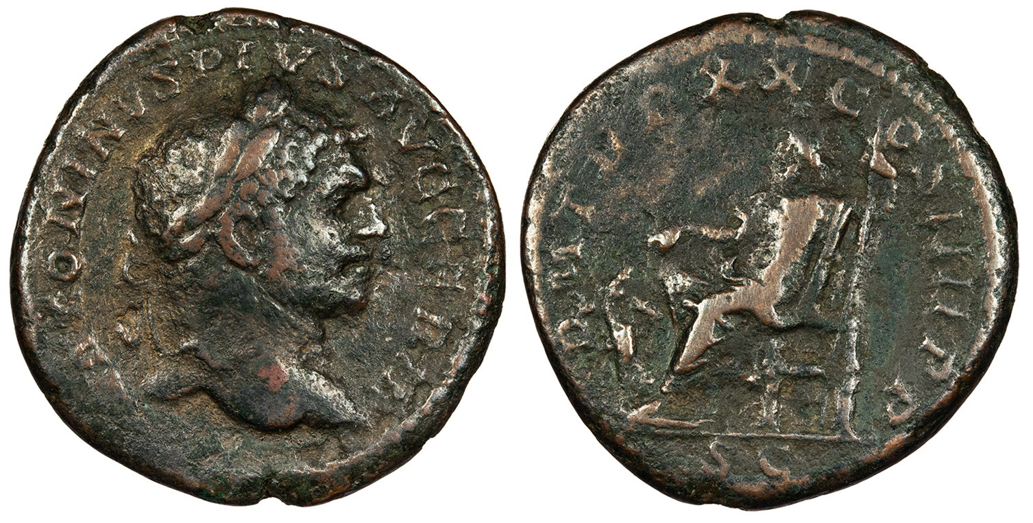 AE As 25mm. 9.89g. Rome Mint 217 A.D. Head, laureate, r. ANTONINVS PIVS AVG GERM Pluto, wearing polos, seated l., r. hand on knee, holding sceptre in l. hand; to l., Cerberus; In ex: SC P M TR P XX COS IIII P P RIC IV 569 Near VF. Green-brown mottled patina. Moderate roughness. Includes old European dealer's ticket.