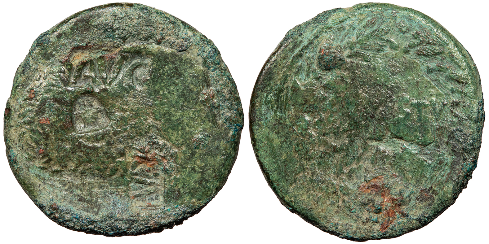 Uncertain host; countermark: Pangerl 89, (83 AVG?), (98 helmet?) Fine. Dark green patina. Some roughness and corrosion, as expected. Some cleaning marks. The host coin is uncertain (most likely an issue of Augustus issued in Antioch or Ephesos). The TI.C.A countermark is believed to have been struck by Claudius. There are two other countermarks present which may likely date to the reign of Vespasian to Titus, probably AVG and a helmet, but are uncertain.