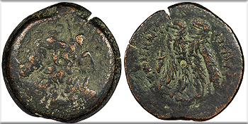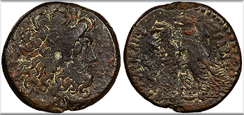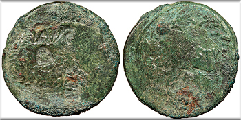 Host: RPC I 4100 (Antioch); countermarks: Pangerl 83 (AVG), 90 (TI.CAE), 98 (helmet), and 95? (dolphin) Fine. Mottled green patina. Scarce. A bit rough, with some light cleaning marks. The host is an as of Augustus struck in Antioch, Seleucis & Pieria, circa 27-23 B.C. but countermarked in Moesia and Thrace under Vespasian or Titus. There may be a softly applied dolphin countermark on the reverse (Pangerl 95), as is typical of this countermark combination.