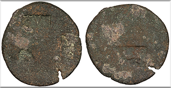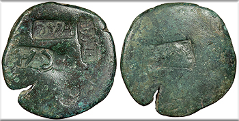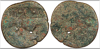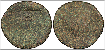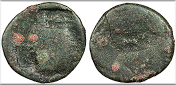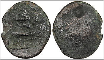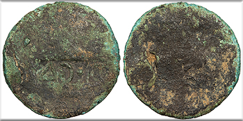 Host: uncertain; countermarks: Pangerl 83 (AVG), 89 (TI.C.A.),, 98 (helmet), and 95 (dolphin) Fine. Brown patina. Fairly clear dolphin countermark. Rough and porous. The host coin is uncertain (most likely an as of Augustus issued in Antioch or Ephesos), but was countermarked most recently in Moesia and Thrace under Vespasian or Titus. The TI.C.A countermark is believed to have been struck most likely under Claudius, and the dolphin most likely under Tiberius.