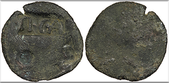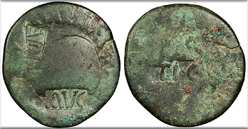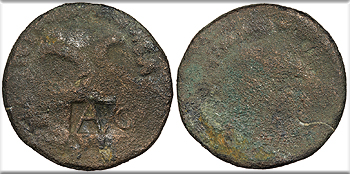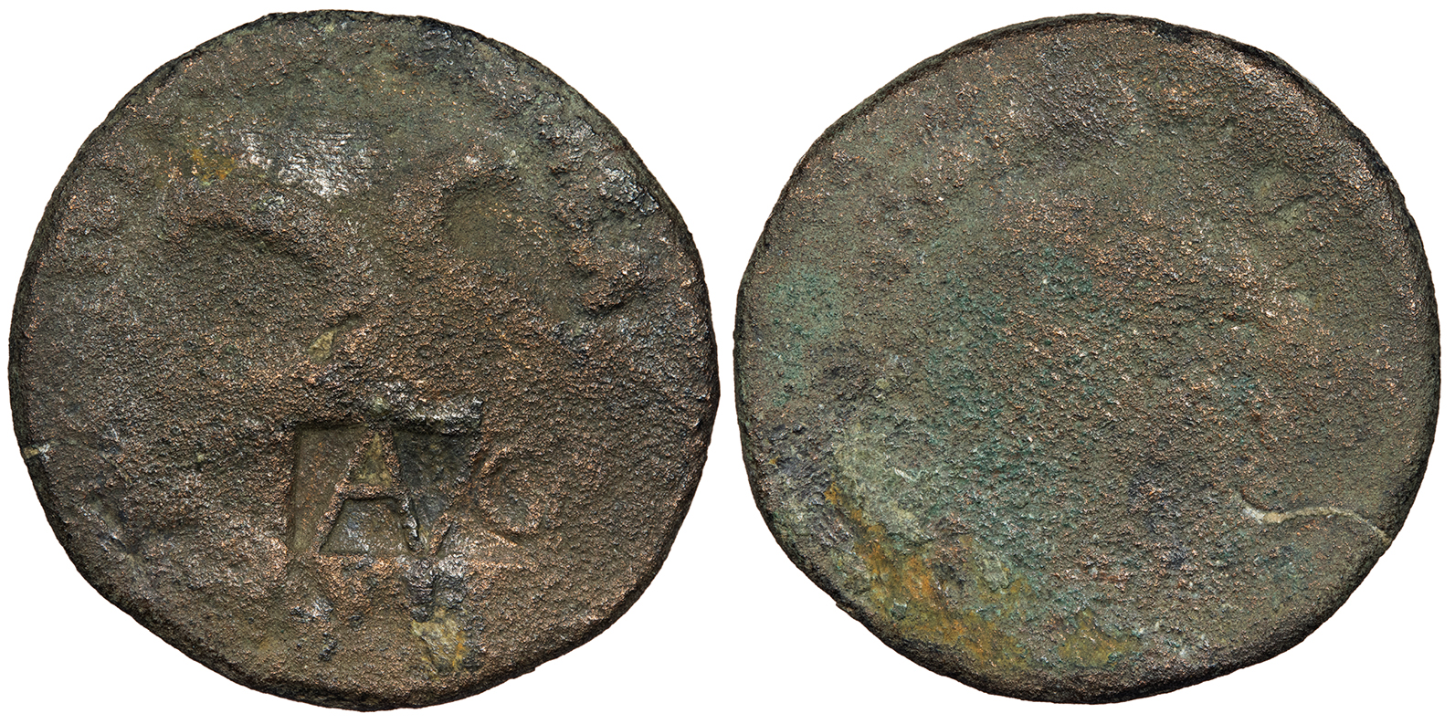 Uncertain host; countermark: cf. Pangerl 89 About Fine. Dark green patina. Unusual retrograde countermark. Light roughness and corrosion, as expected. Gouge on reverse. The host coin is uncertain (most likely an issue of Augustus issued in Antioch or Ephesos). The TI.C.A countermark is believed to have been struck by Claudius, but the crude retrograde examples are believed to be imitative and unofficially struck.