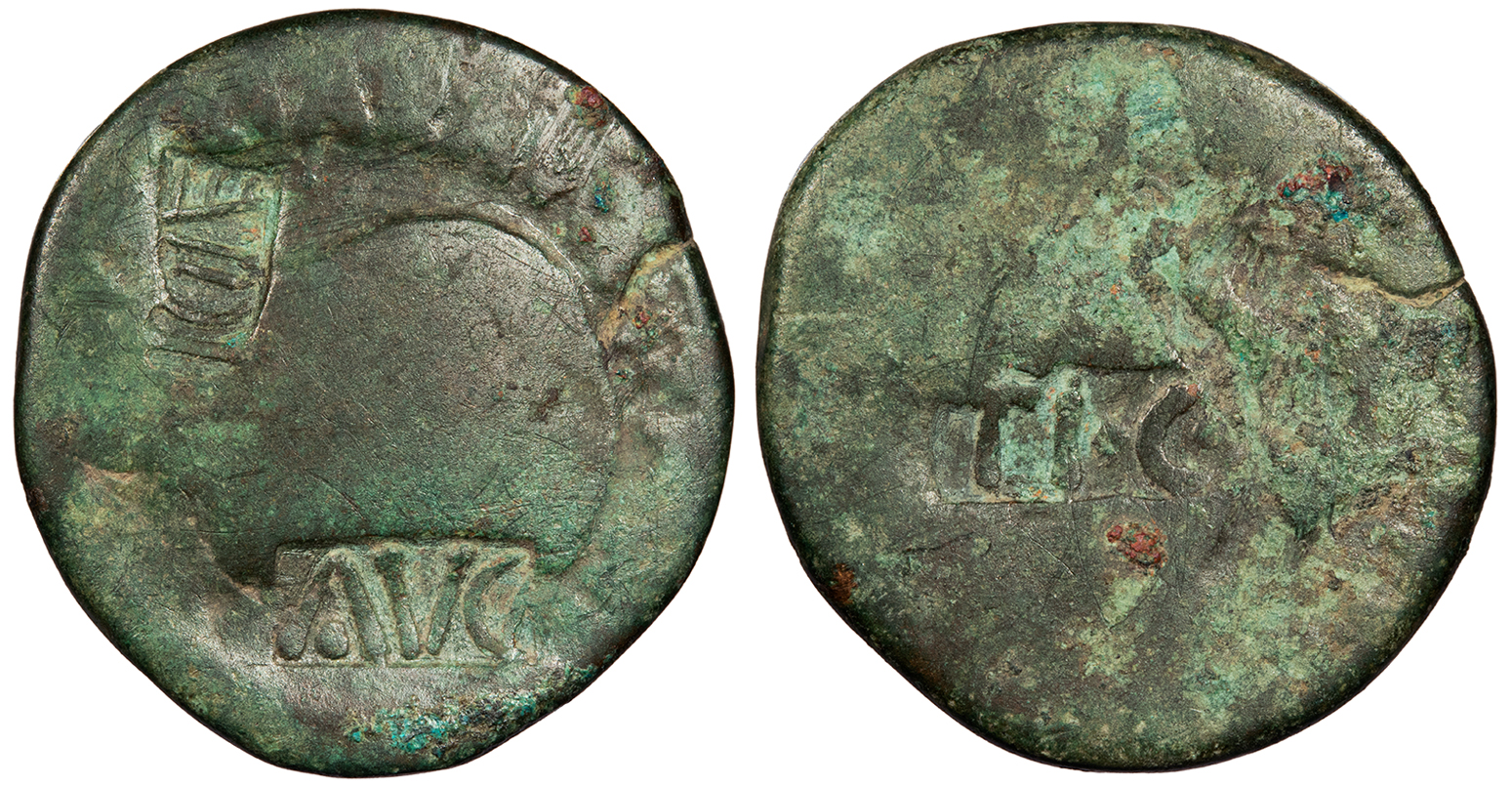 Uncertain host; countermarks: cf. Pangerl 83 (AVG), cf. 89 (TI.C.A), 95 (dolphin), 98 (helmet) About Fine. Dark green patina. Scarce retrograde countermark. Roughness and corrosion, as expected. The host coin is uncertain (probably an Eastern issue of Augustus, as is typical with these countermarks), but was countermarked in Moesia and Thrace under Vespasian or Titus. The dolphin is believed to have most likely been added under Tiberius and the TI.C.A by Claudius, but the retrograde variety is believed to have been imitative and unofficially struck.
