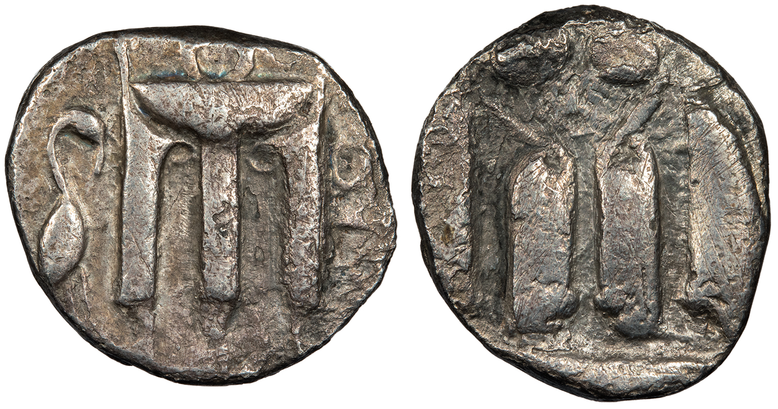 AR Stater 21mm. 7.10g. Tripod with three handles and the legs ending in lion's paws; to l., crane standing to r.; (koppa)PO (retrograde) to r.; border of dots.
