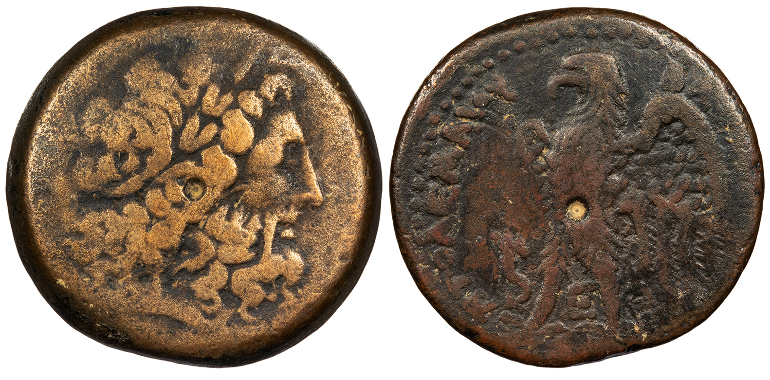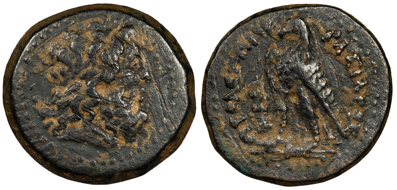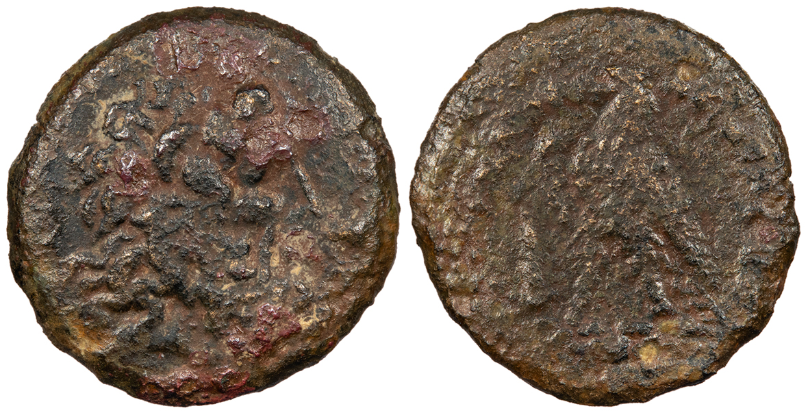 Two eagles standing l. on thunderbolt, cornucopiae to l. BASILEWS PTOLEMAIOU CPE B745; Svoronos 1426 Near VF. Mottled brown patina. Some minor roughness and small adhesions. Some weakness of strike.