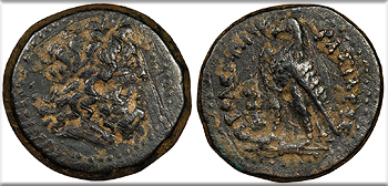 Eagle standing l. on thunderbolt; club to l. BASILEWS PTOLEMAIOU CPE B471; Svoronos 711 Near VF. Scarce. Mottled brown patina. Fairly rough. A budget example.