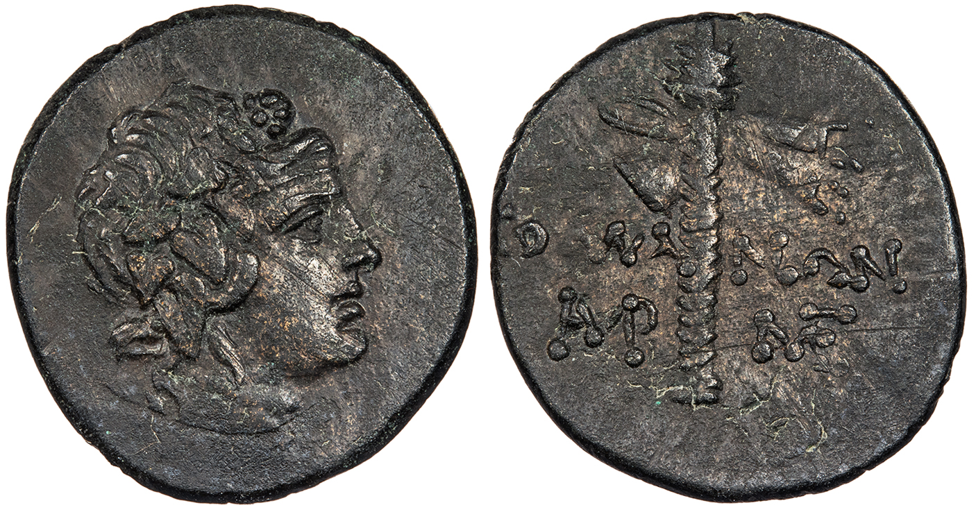Filleted thyrsos, legend to either side; monogram to l. and r. below. KOMA-NWN HGC 7, 283; SNG Black Sea 1264 VF. Very rare. Black patina with nice portrait. Excellent obverse centering. A few thin flan flaws and trace porosity. Few examples auctioned in the past two decades; this example is superior to most. From the Southwood Collection. Reduced from: $180
