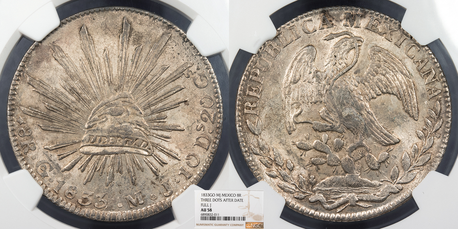 MEXICO Republic 1833-Go MJ Full 'J'; Three dots after date 8 Reales NGC AU-58 -- #WC100598