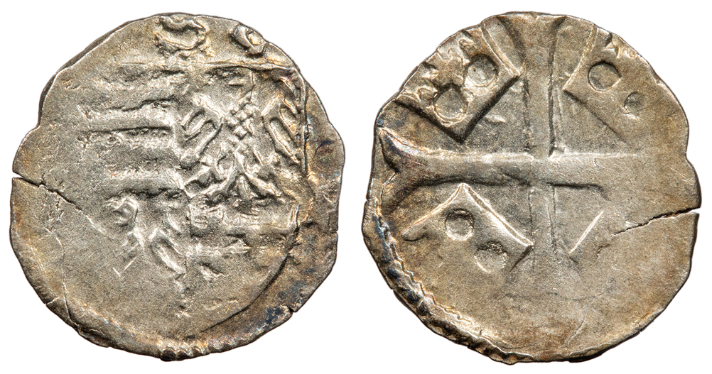 AR Parvus 10mm. 0.26g. 1387-1427 Arms of Hungary and Brandenburg. S -V -R Cross fourchée quartered with coronets.