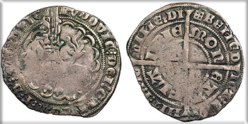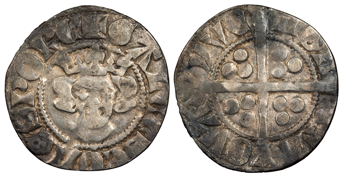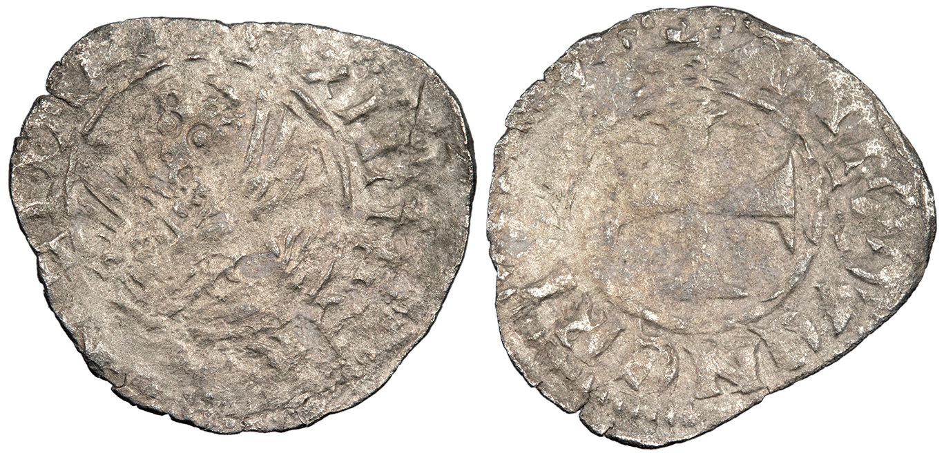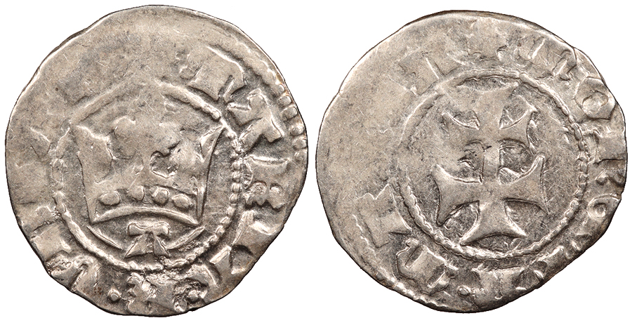 AR Esterlin (Imitating sterling penny) 17mm. 0.90g. Yves Mint. 1313-1322 Crowned bust facing. +GALChS COMES PORC Long cross quartered with pellet trefoils. MON -ETN -OVA -YVE Mayhew 237; Poey 6101; Roberts 8599 VF. Some spots of darker toning and minor encrustation. Clipped.