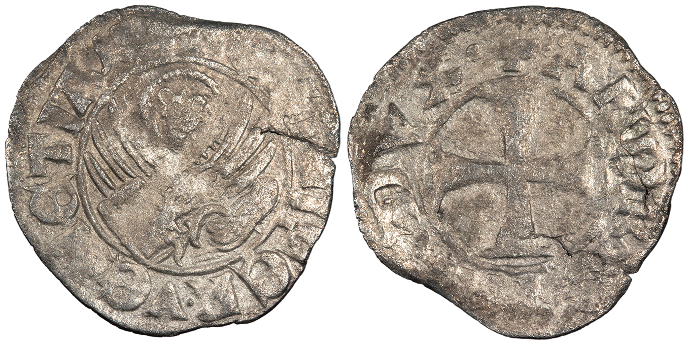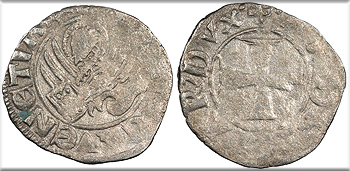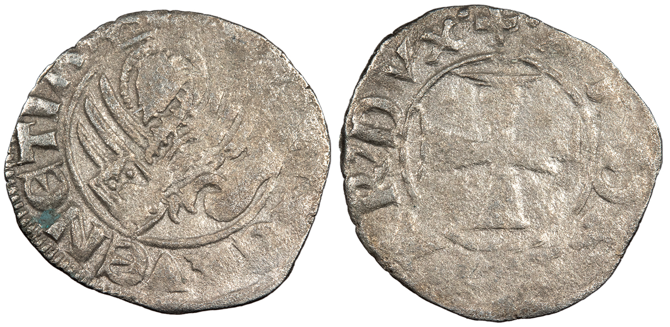 AR Tornesello 17mm. 0.60g. Cross pattée. + ANDR' 9TAR' DVX Winged lion of St Mark holding gospel. + VEXILIFER .VENETIAL CNI VII, p.102, #68 VF. Moderate porosity.