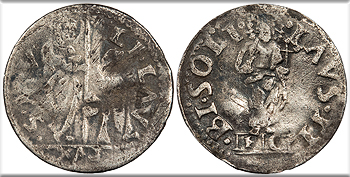 Bi 1/2 Grosso (Pieron) 17mm. 0.94g. Pope seated facing. PIVS. PP. - QVINTVS: Cross quartered with crossed keys. CARO - .C. DE B. - ORBO - N. L. AVENO MIR 1102; Munt. 41; Berman 1132 VF. Toned. Scarce. Typical porosity.