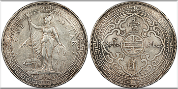 AR Trade Dollar 39mm. 26.89g. Bombay Mint. Britannia standing before sailing ship, holding trident and supporting shield.