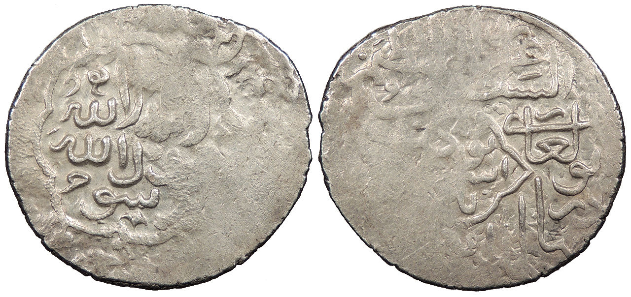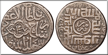 Kalima in square; mint name within central circle; names of the Rashidun in margins.