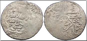 AR 2 Dirhams 16mm. 1.50g. Baghdad Mint AH741-744 (1340-1343 A.D.) Legend in two lines, mint name below; within pointed hexafoil.