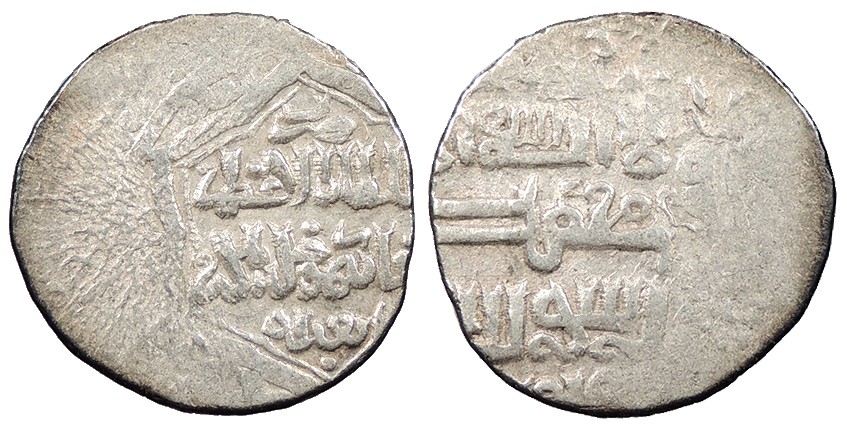 AR 2 Dirhams 16mm. 1.50g. Baghdad Mint AH741-744 (1340-1343 A.D.) Legend in two lines, mint name below; within pointed hexafoil.