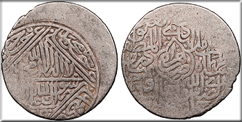 Album 2386 VF. Scarce. Light envelope toning with trace multicolor iridescence. Slightly off-center and uneven strike. This type features numerous reverses determined by mint, all encompassed by Album number 2386. This is the Herat type, consisting of five circles surrounding a central space usually containing the mint name (absent on this example).