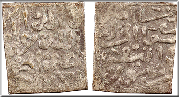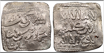 AR Square Dirham 16mm. 1.50g. (no mint) (no date) Naskhi Kalima in three lines, dotted border.