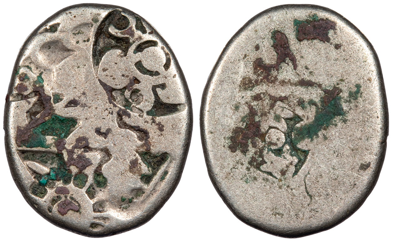 Mitch. 436 Near VF. Scarce. Toned. Lightly porous, as typical. It is believed that the reverse legend refers to Omkar Mandhata, a temple in Malwa, which may have been the issuer.