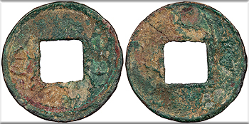 AE 5 Zhu 19mm. 0.83g. 14 - 23 A.D. Two characters flanking square hole. Huo Quan Blank.